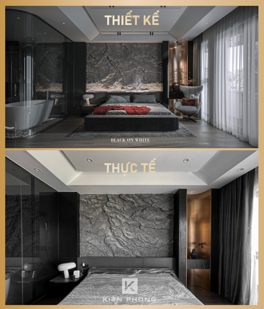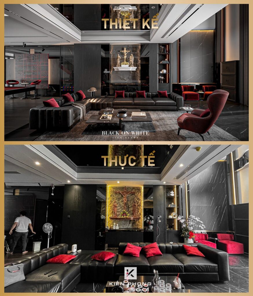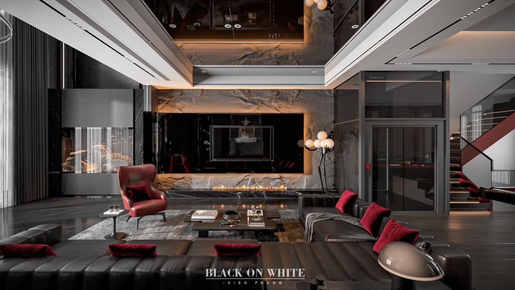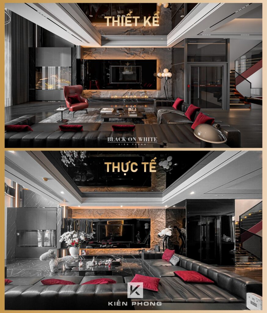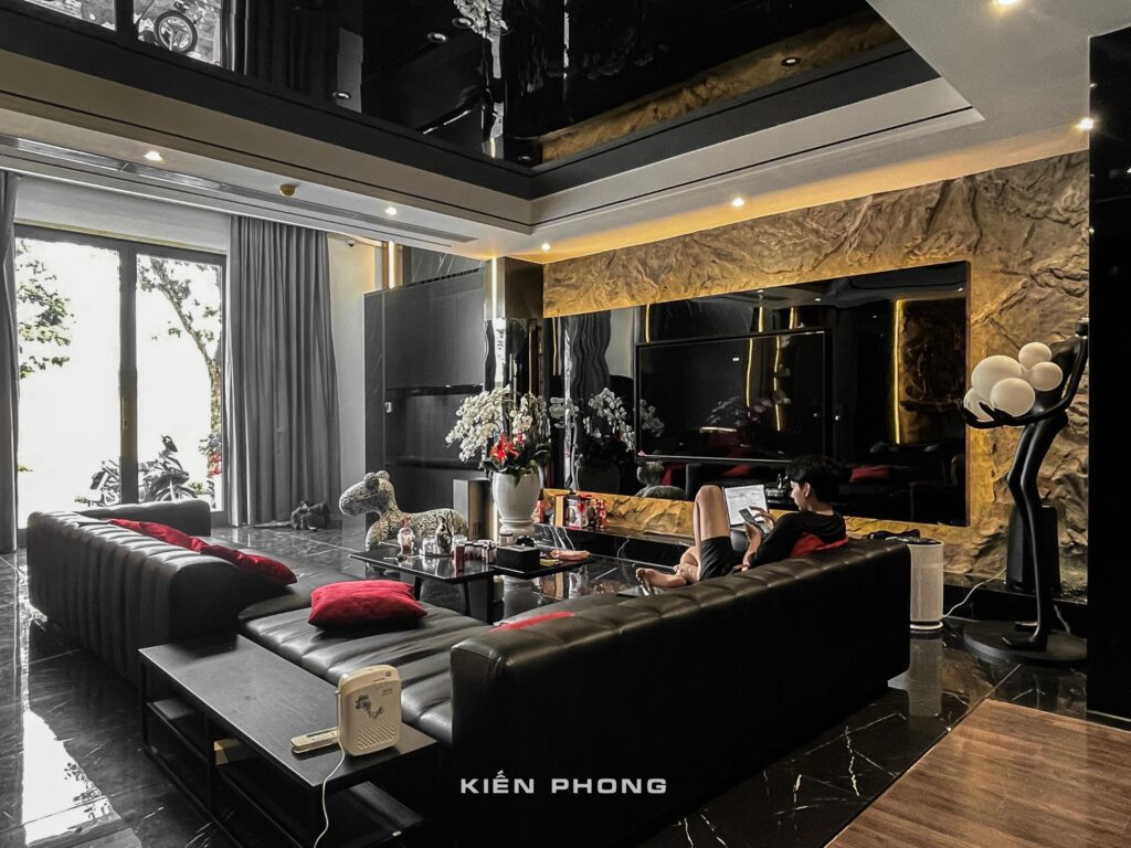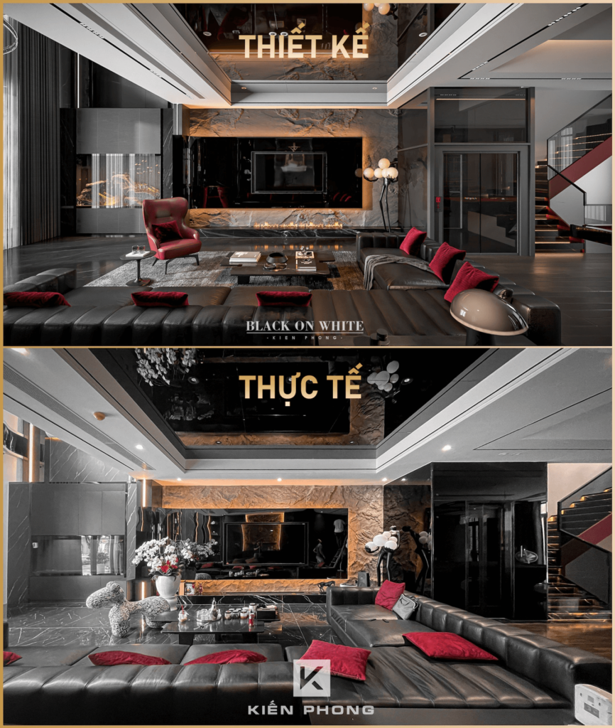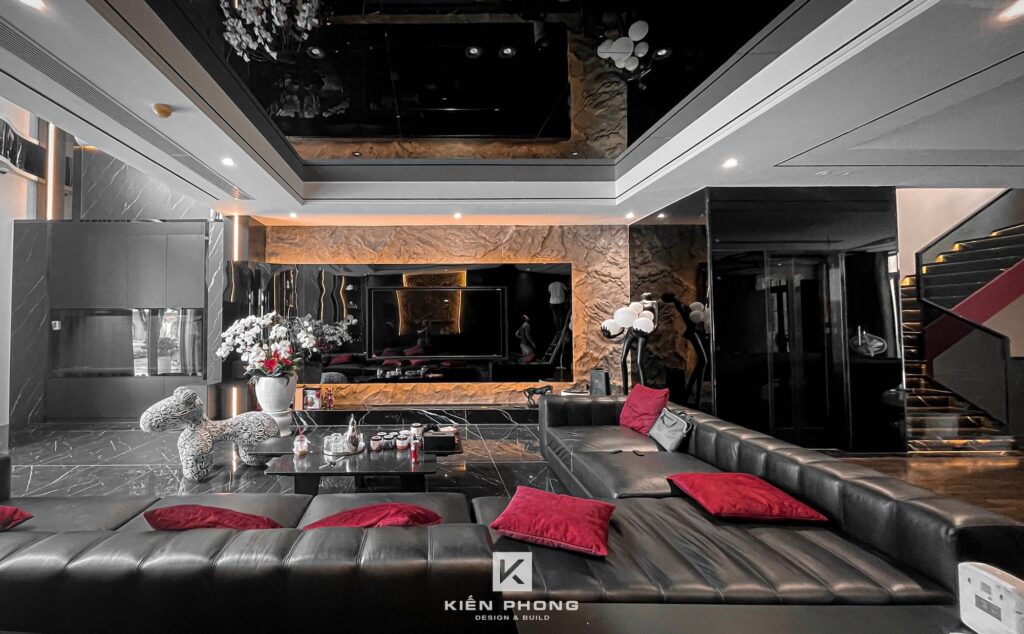 Tổng thể ngôi nhà sử dụng tone Đen – Trắng – Đỏ, tưởng chừng như nặng nề nhưng với Kiến Phong đã đem đến một không gian ấn tượng với thiết kế tinh tế, và nội thất cao cấp thể hiện lối sống thượng lưu của gia chủ. Các bức tường được Kiến Phong trang trí bằng mảng đá đen nghệ thuật kết hợp cùng hệ cửa lớn đón ánh sáng và gió, tạo nên nét thô sơ mang đến một trải nghiệm hoàn toàn mới như được trở về với thiên nhiên, trở về với chính mình.