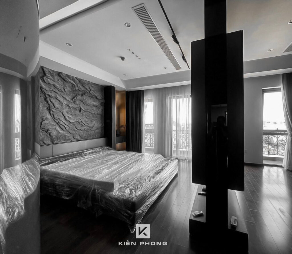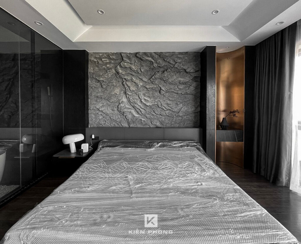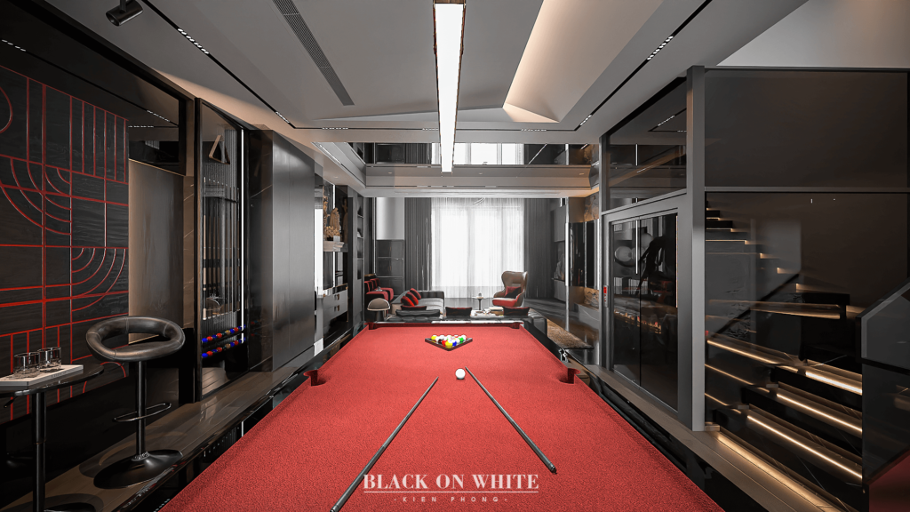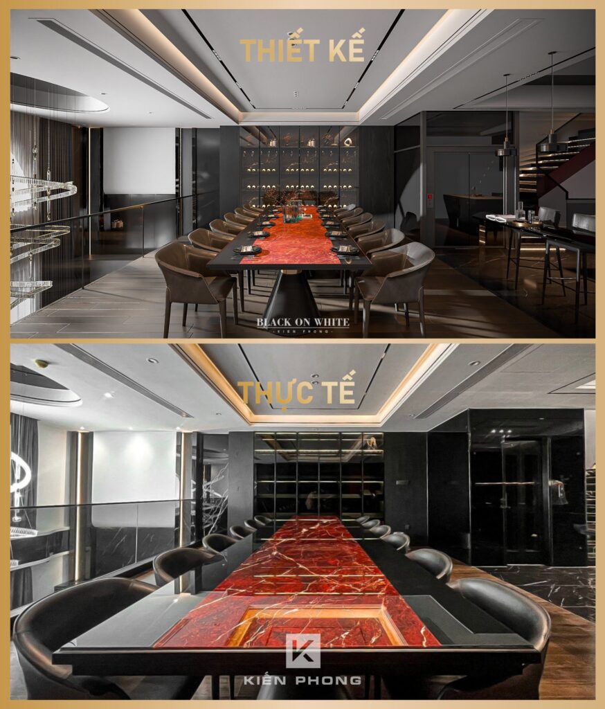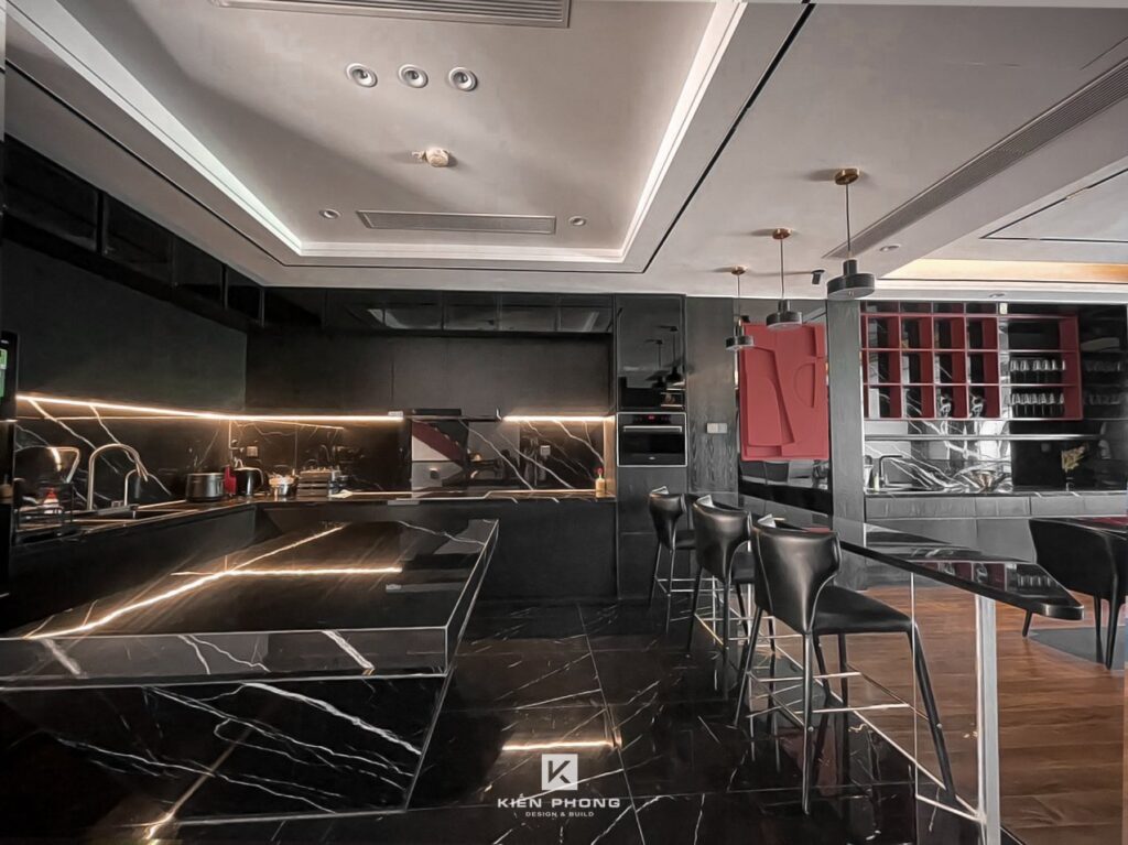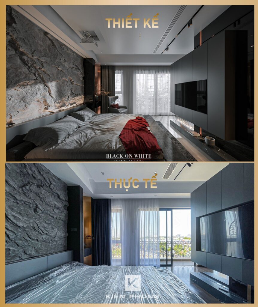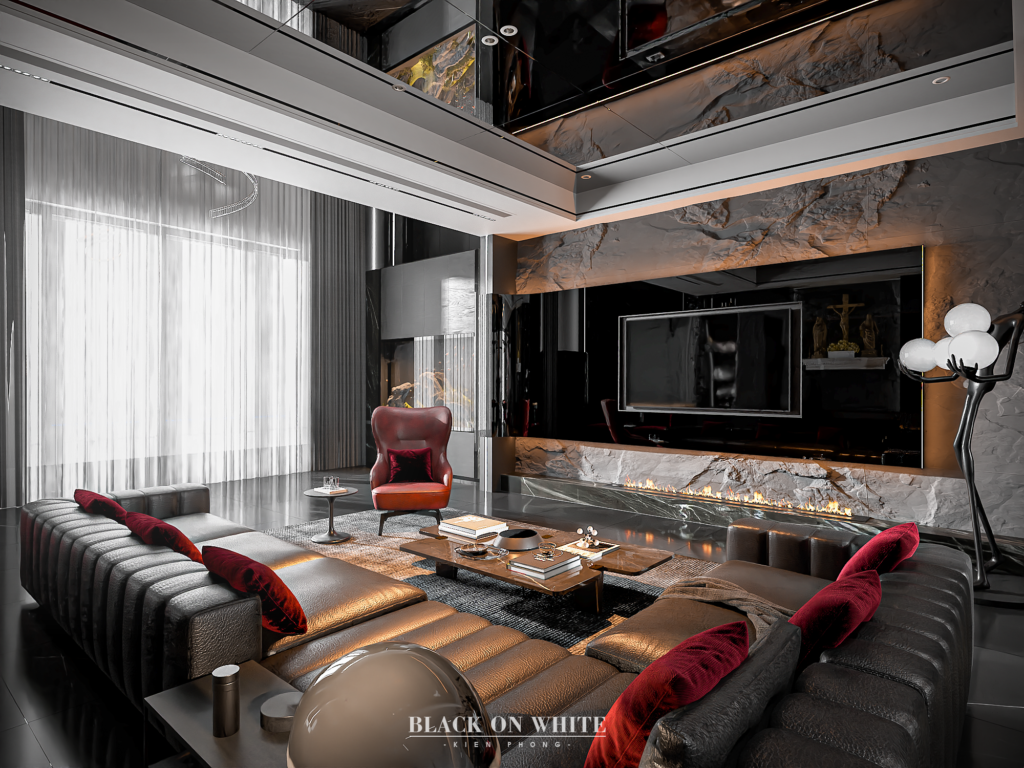 Tổng thể ngôi nhà sử dụng tone Đen – Trắng – Đỏ, tưởng chừng như nặng nề nhưng với Kiến Phong đã đem đến một không gian ấn tượng với thiết kế tinh tế, và nội thất cao cấp thể hiện lối sống thượng lưu của gia chủ. Các bức tường được Kiến Phong trang trí bằng mảng đá đen nghệ thuật kết hợp cùng hệ cửa lớn đón ánh sáng và gió, tạo nên nét thô sơ mang đến một trải nghiệm hoàn toàn mới như được trở về với thiên nhiên, trở về với chính mình.