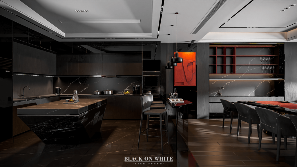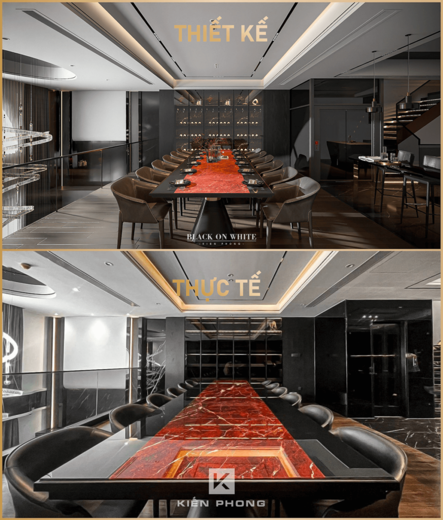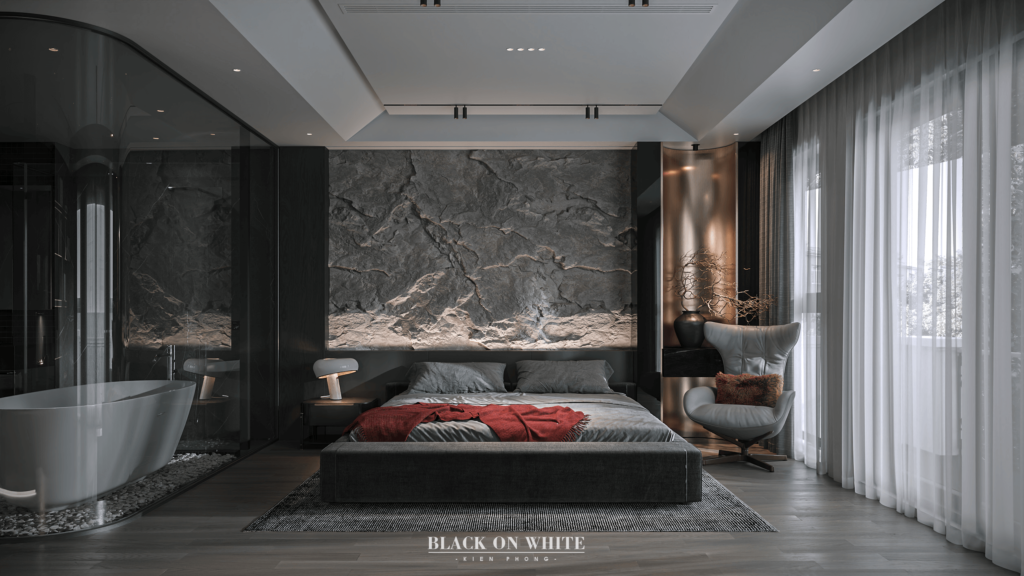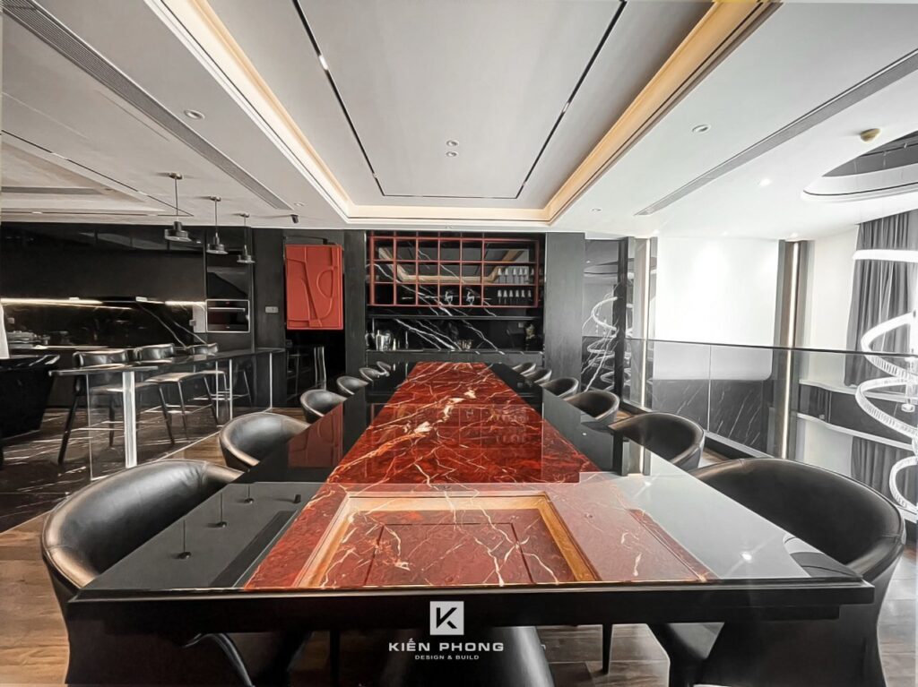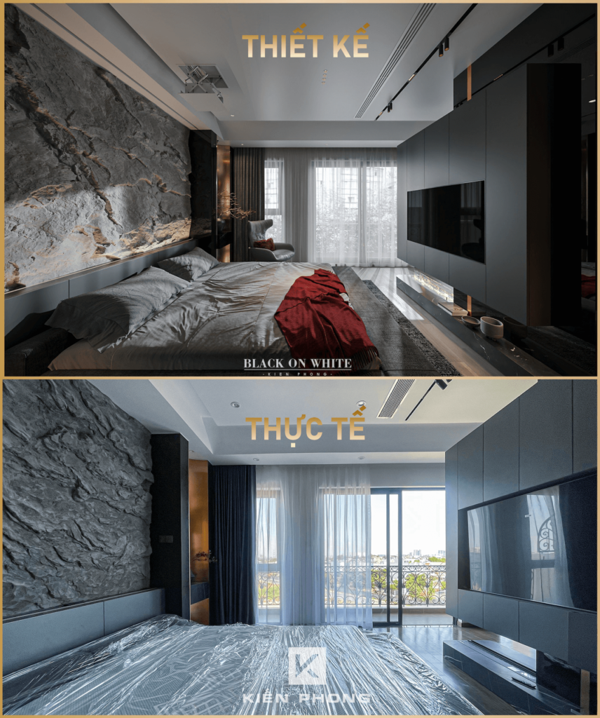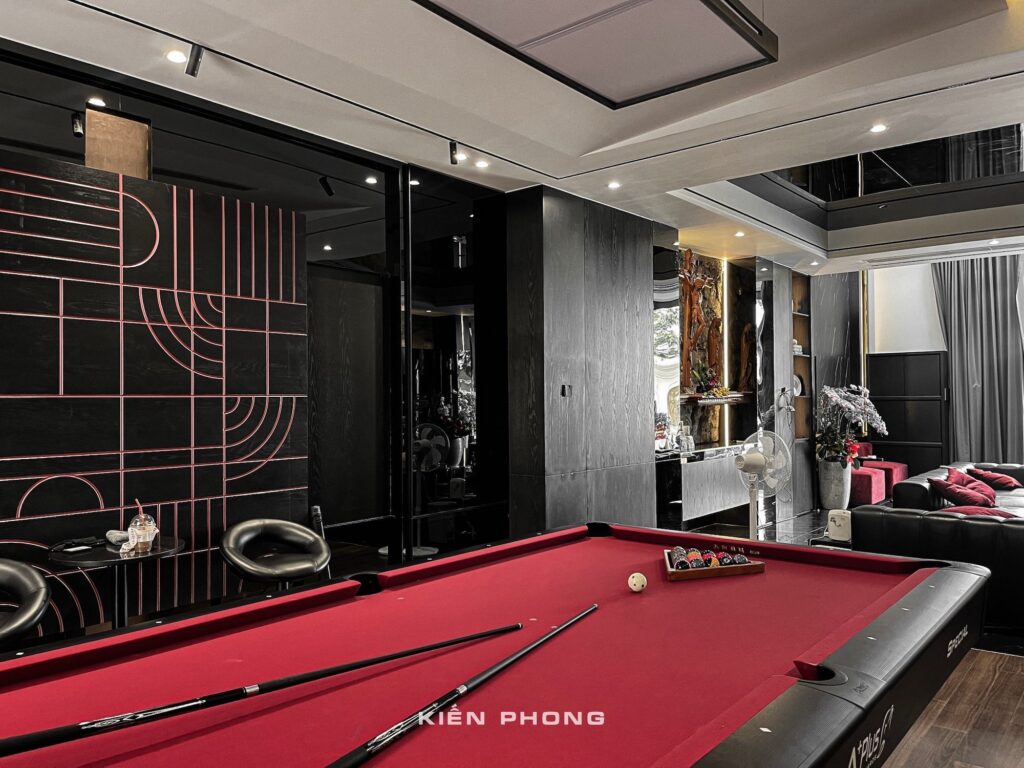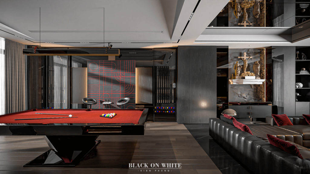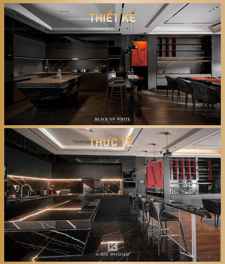 Tổng thể ngôi nhà sử dụng tone Đen – Trắng – Đỏ, tưởng chừng như nặng nề nhưng với Kiến Phong đã đem đến một không gian ấn tượng với thiết kế tinh tế, và nội thất cao cấp thể hiện lối sống thượng lưu của gia chủ. Các bức tường được Kiến Phong trang trí bằng mảng đá đen nghệ thuật kết hợp cùng hệ cửa lớn đón ánh sáng và gió, tạo nên nét thô sơ mang đến một trải nghiệm hoàn toàn mới như được trở về với thiên nhiên, trở về với chính mình.