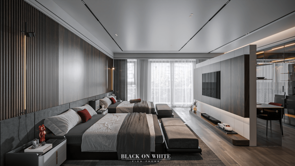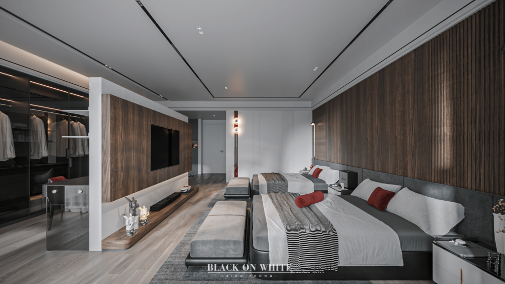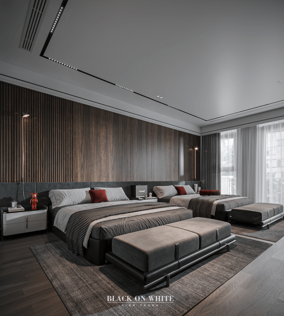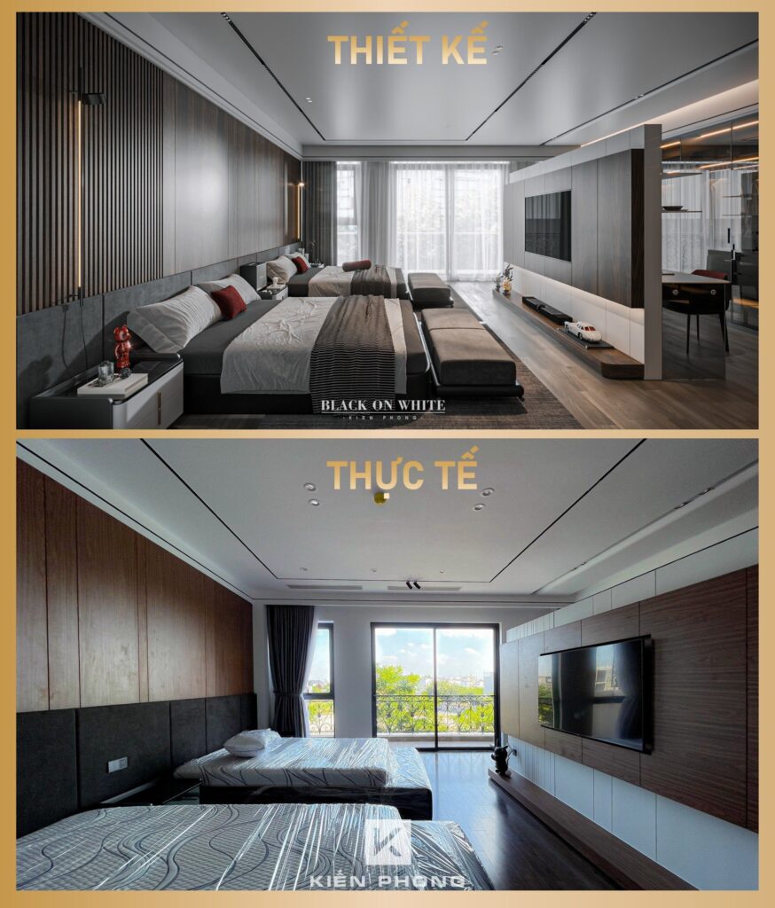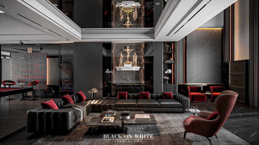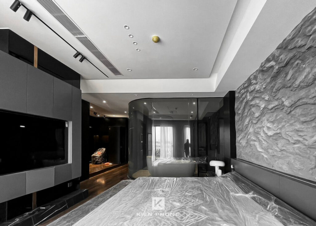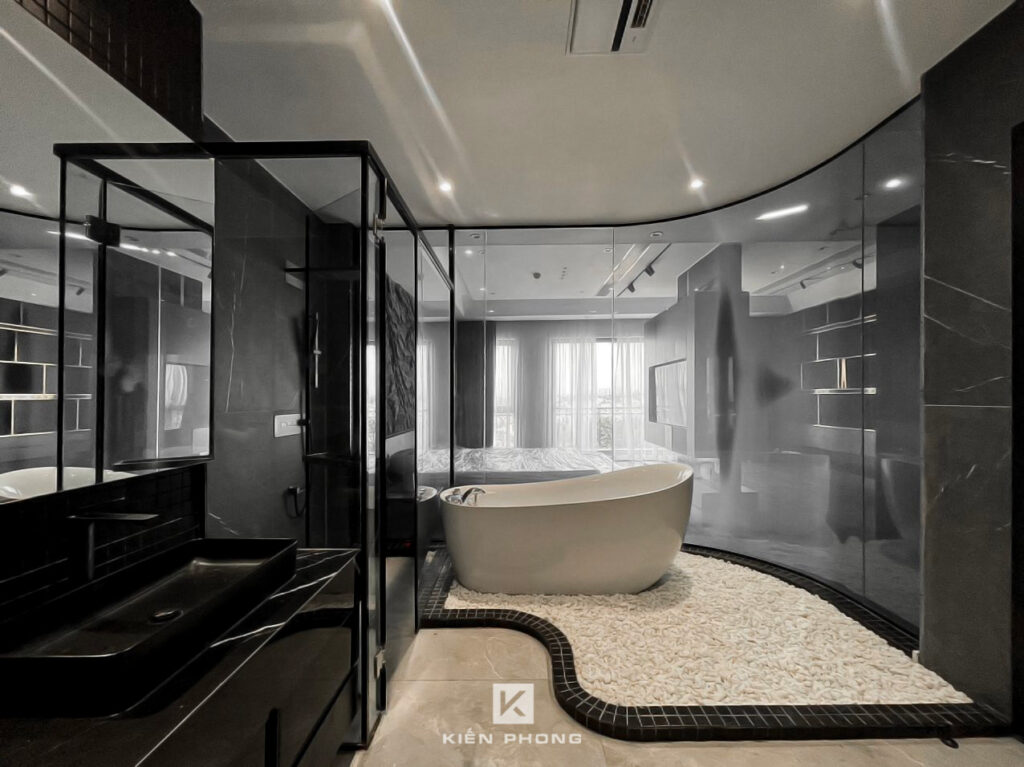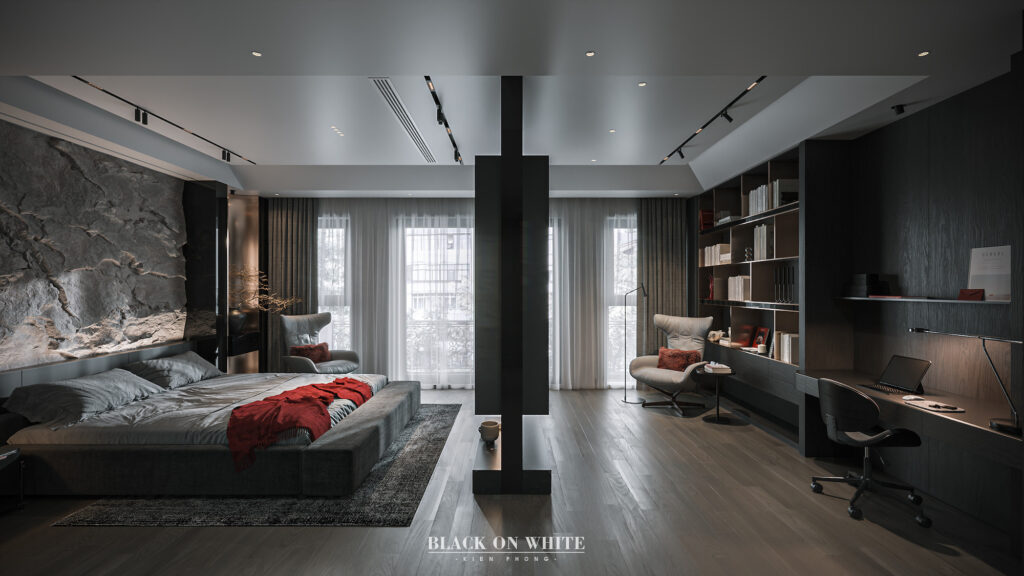 Tổng thể ngôi nhà sử dụng tone Đen – Trắng – Đỏ, tưởng chừng như nặng nề nhưng với Kiến Phong đã đem đến một không gian ấn tượng với thiết kế tinh tế, và nội thất cao cấp thể hiện lối sống thượng lưu của gia chủ. Các bức tường được Kiến Phong trang trí bằng mảng đá đen nghệ thuật kết hợp cùng hệ cửa lớn đón ánh sáng và gió, tạo nên nét thô sơ mang đến một trải nghiệm hoàn toàn mới như được trở về với thiên nhiên, trở về với chính mình.