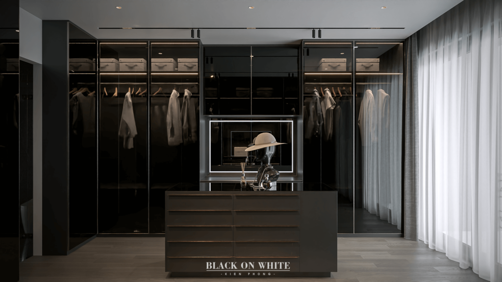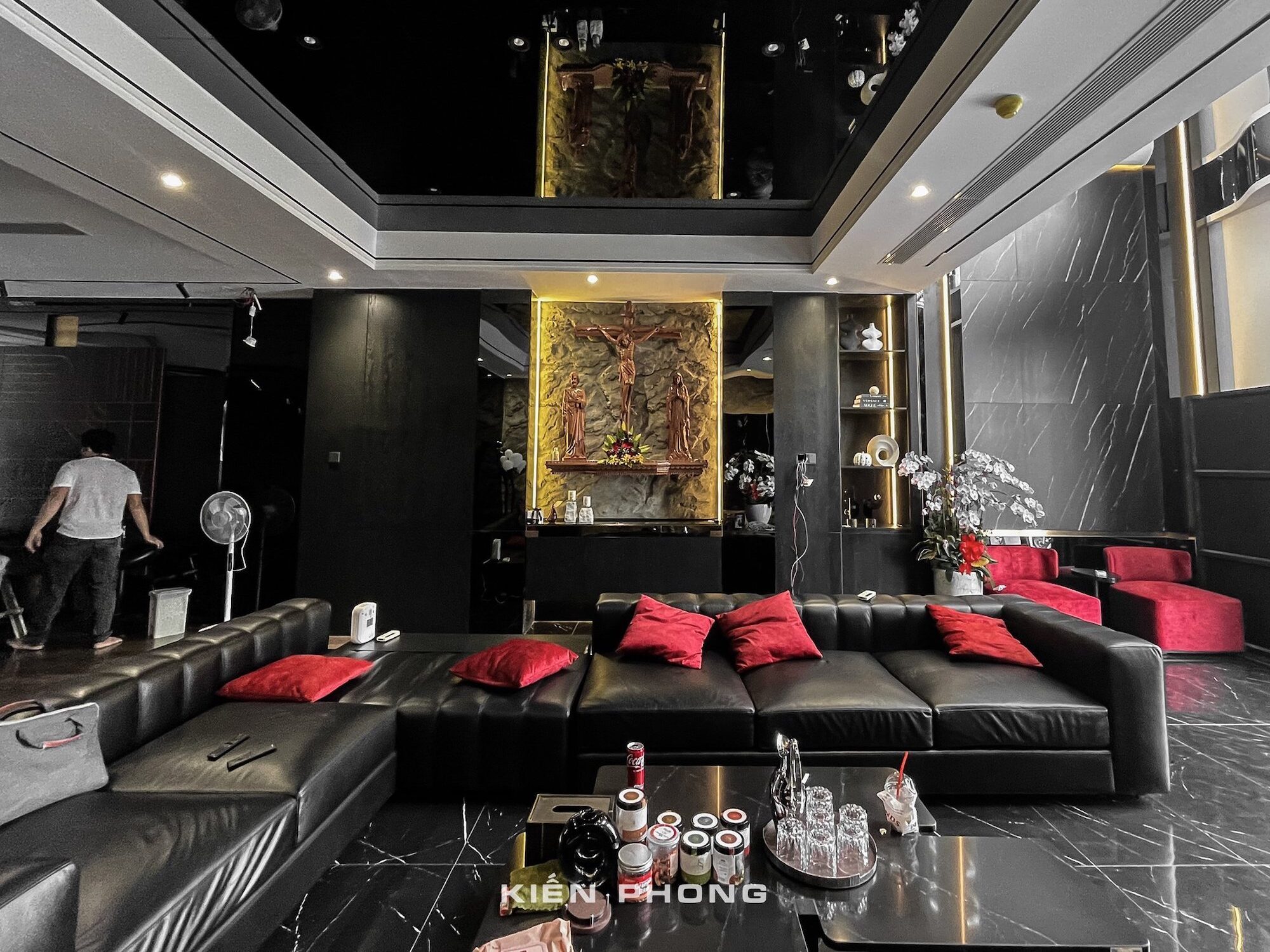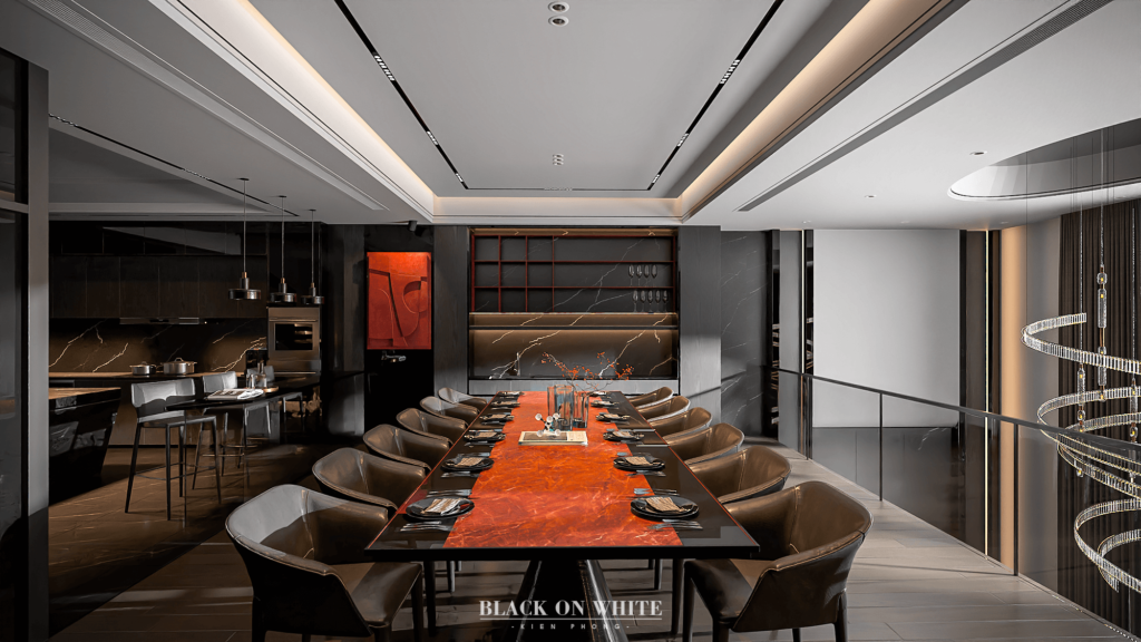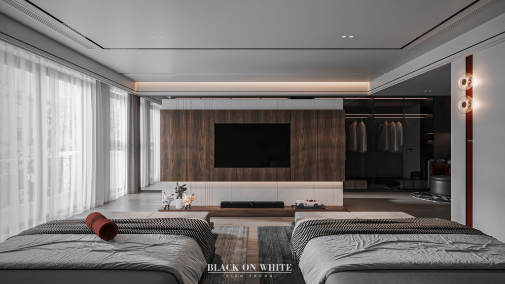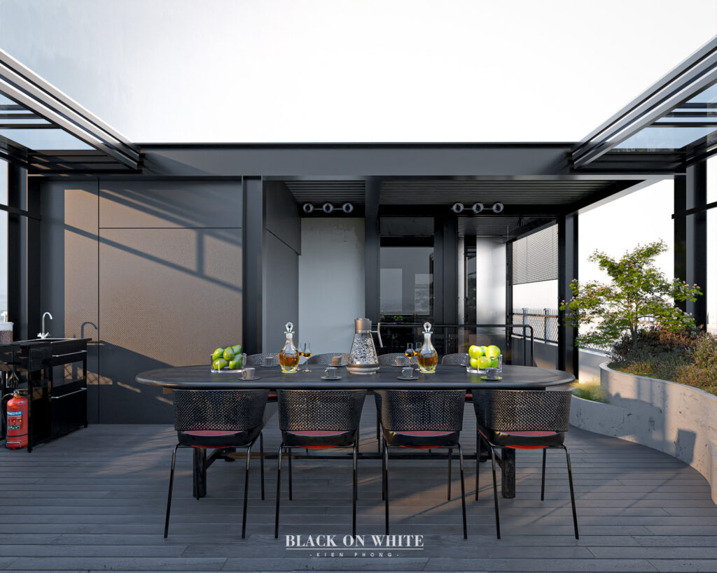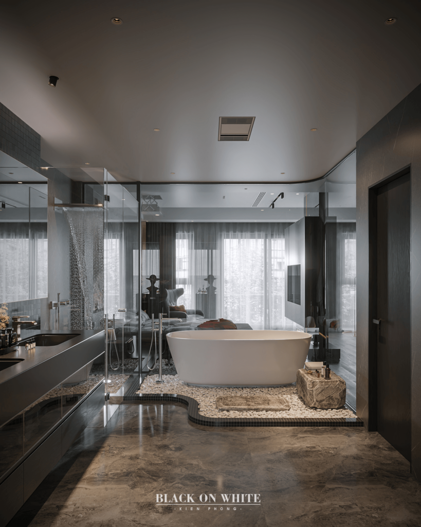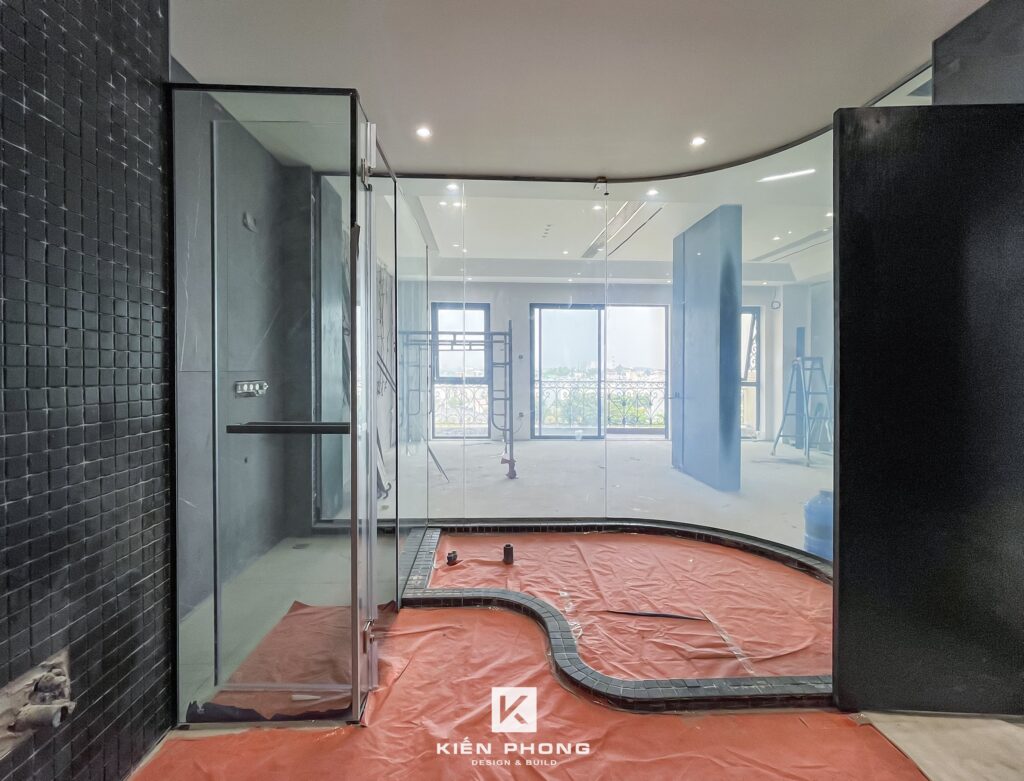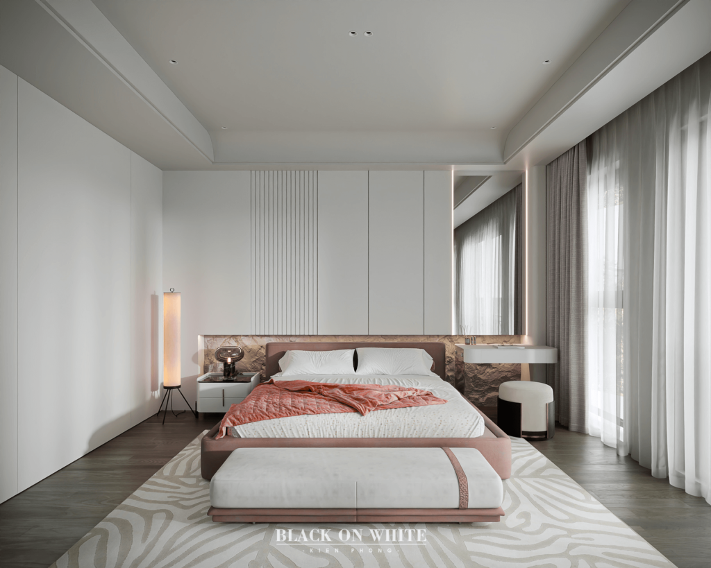 Tổng thể ngôi nhà sử dụng tone Đen – Trắng – Đỏ, tưởng chừng như nặng nề nhưng với Kiến Phong đã đem đến một không gian ấn tượng với thiết kế tinh tế, và nội thất cao cấp thể hiện lối sống thượng lưu của gia chủ. Các bức tường được Kiến Phong trang trí bằng mảng đá đen nghệ thuật kết hợp cùng hệ cửa lớn đón ánh sáng và gió, tạo nên nét thô sơ mang đến một trải nghiệm hoàn toàn mới như được trở về với thiên nhiên, trở về với chính mình.