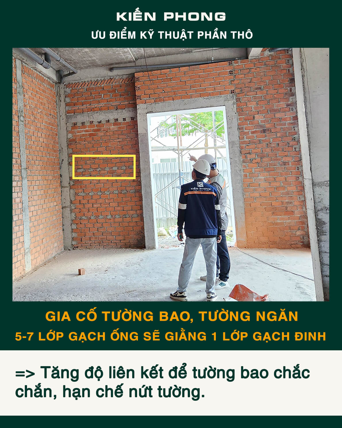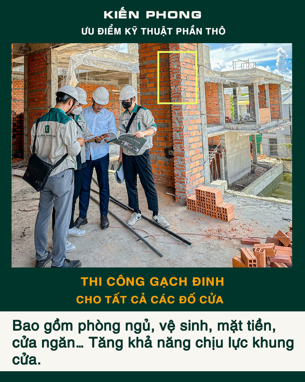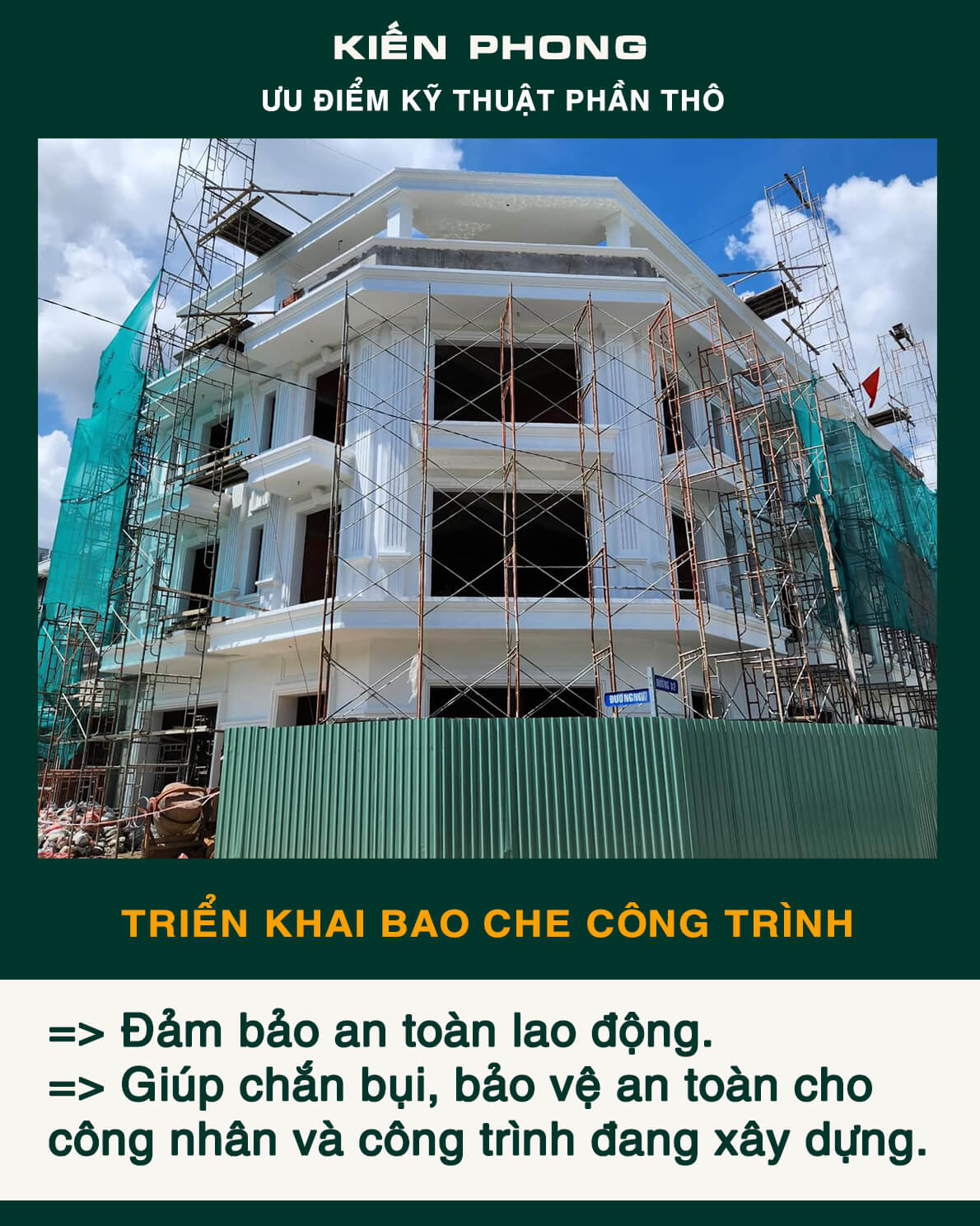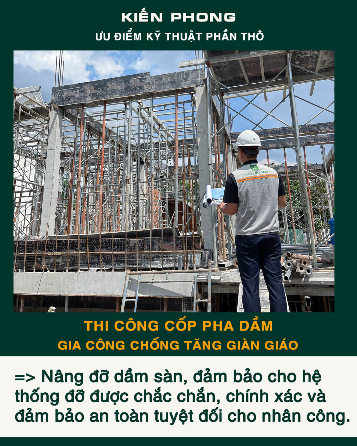 Bên cạnh trang bị đầy đủ thiết bị, coffa, giàn giáo, bao che, để đảm bảo an toàn, tiến độ – năng suất và tiết kiệm trong công tác thi công. Kiến Phong liên tục cập nhật quy trình quản lý chuyên nghiệp, toàn thể đội ngũ kỹ sư, giám sát thi công và mọi công nhân thường xuyên được phổ biến, tập huấn đảm bảo hiểu sâu, nắm chắc và luôn ý thức tuyệt đối chấp hành thi công an toàn và chất lượng.