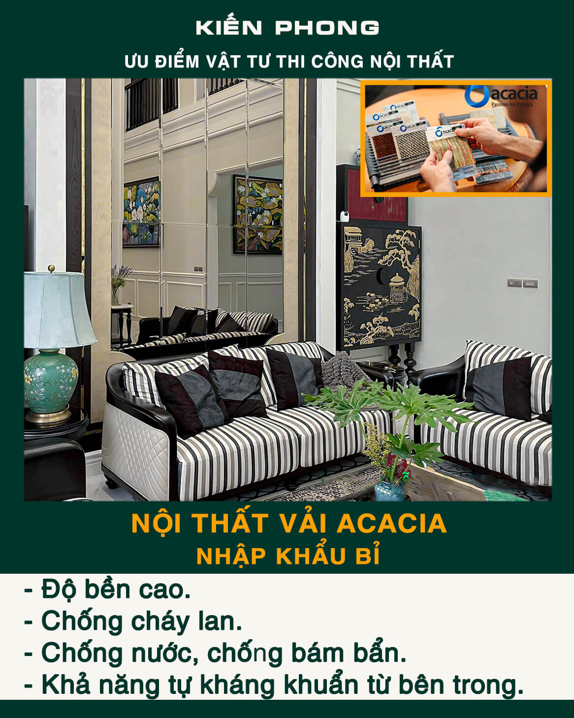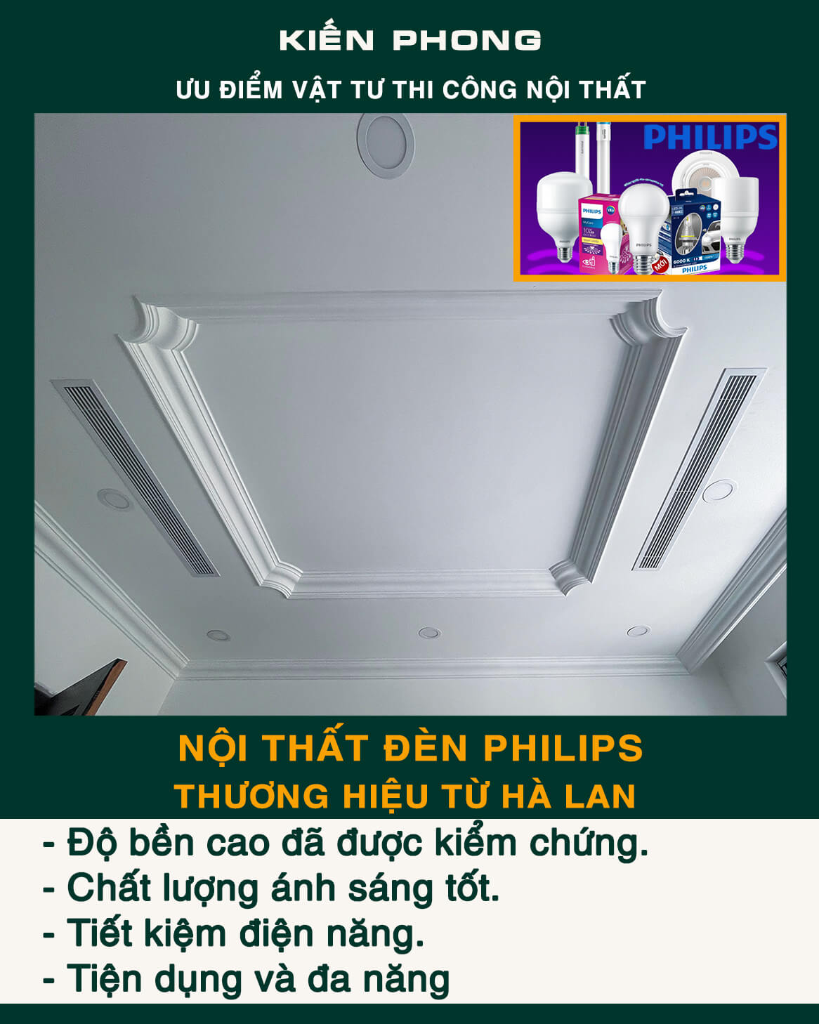 Kiến Phong đảm bảo tiêu chí An toàn và Chất lượng trong thi công với đội ngũ kỹ sư kinh nghiệm. Cam kết sử dụng sản phẩm, nguyên vật liệu, thiết bị và phụ kiện chất lượng, kết hợp ứng dụng công nghệ mới nhất trong thiết kế –  thi công nội thất.